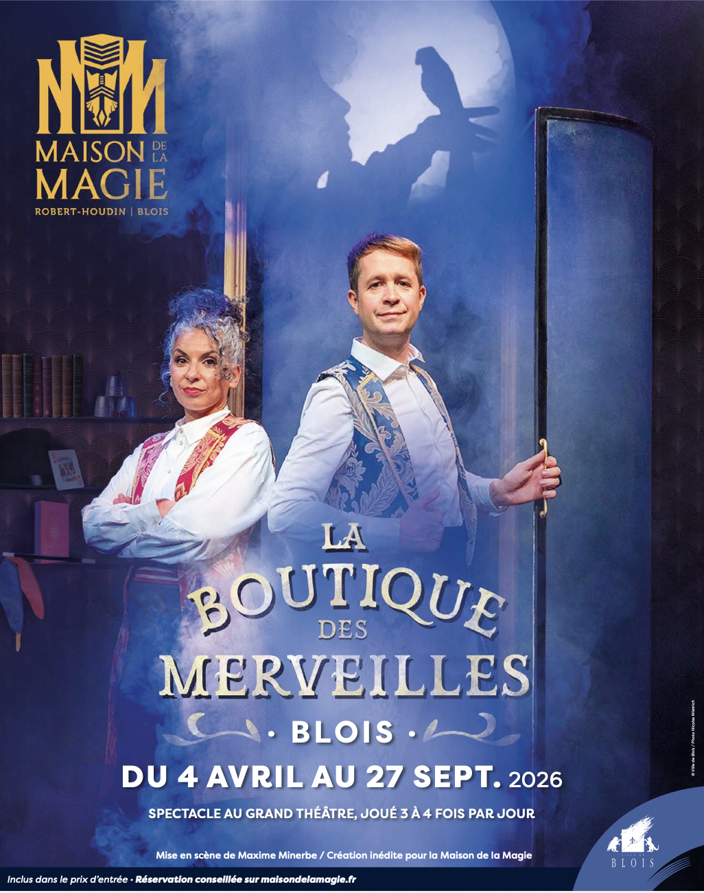 La Boutique des Merveilles est une création originale conçue spécifiquement pour la Maison de la Magie Robert-Houdin de Blois, institution de référence du patrimoine magique français. Le spectacle est joué au Grand Théâtre, trois à quatre fois par jour, du 4 avril au 27 septembre 2026. Une saison longue, dense, portée par une volonté commune : offrir au public une expérience magique et théâtrale inoubliable.