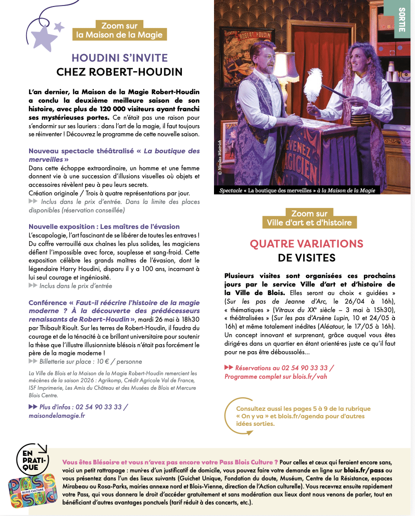 C’est une belle reconnaissance pour le travail accompli : le magazine officiel de la Ville de Blois, Blois Mag, consacre dans son numéro d’avril 2026 un article à la nouvelle saison de la Maison de la Magie Robert-Houdin, mettant en lumière le tout nouveau spectacle théâtralisé dont j’ai signé la mise en scène — La Boutique des Merveilles.