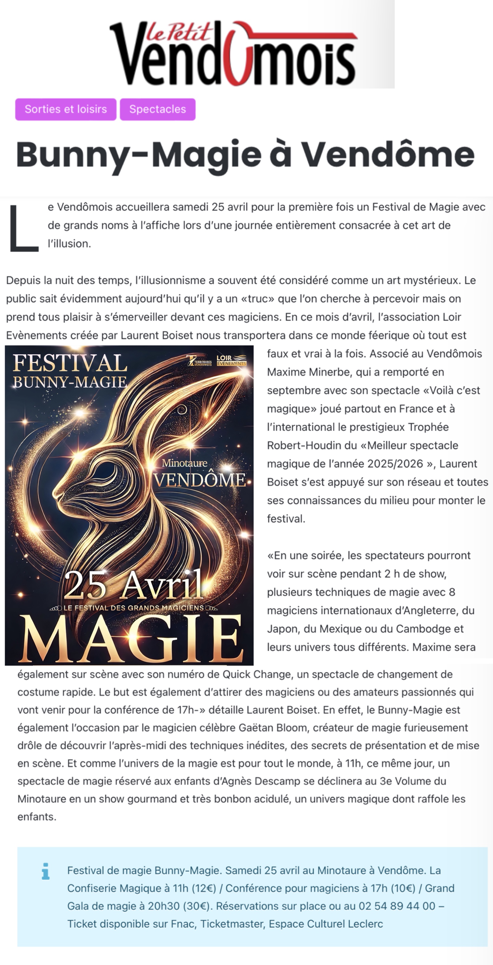 Le magazine Le Petit Vendômois a récemment mis en lumière le Festival Bunny-Magie, un événement majeur qui réunira plusieurs artistes internationaux… dont le magicien vendômois Maxime Minerbe.