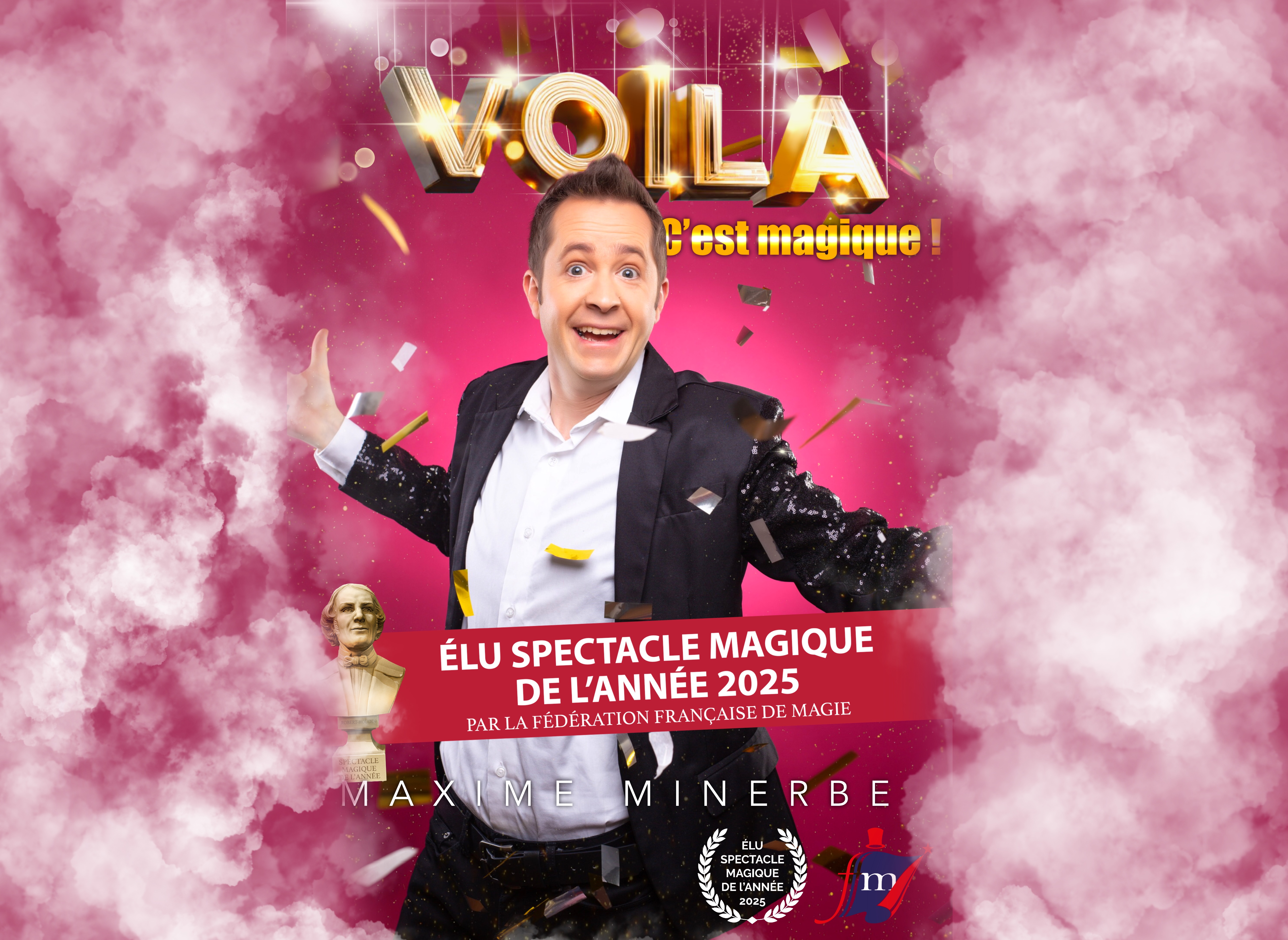 Cette année à Troyes, Maxime Minerbe présentera devant ses pairs un extrait de son spectacle VOILA — une création scénique qui lui a valu le très convoité titre de Meilleur Spectacle Magique de l’Année. Une distinction rare, qui confirme ce que les spectateurs ressentent depuis longtemps : avec VOILA, on n’assiste pas à une simple succession de tours. On vit une expérience.